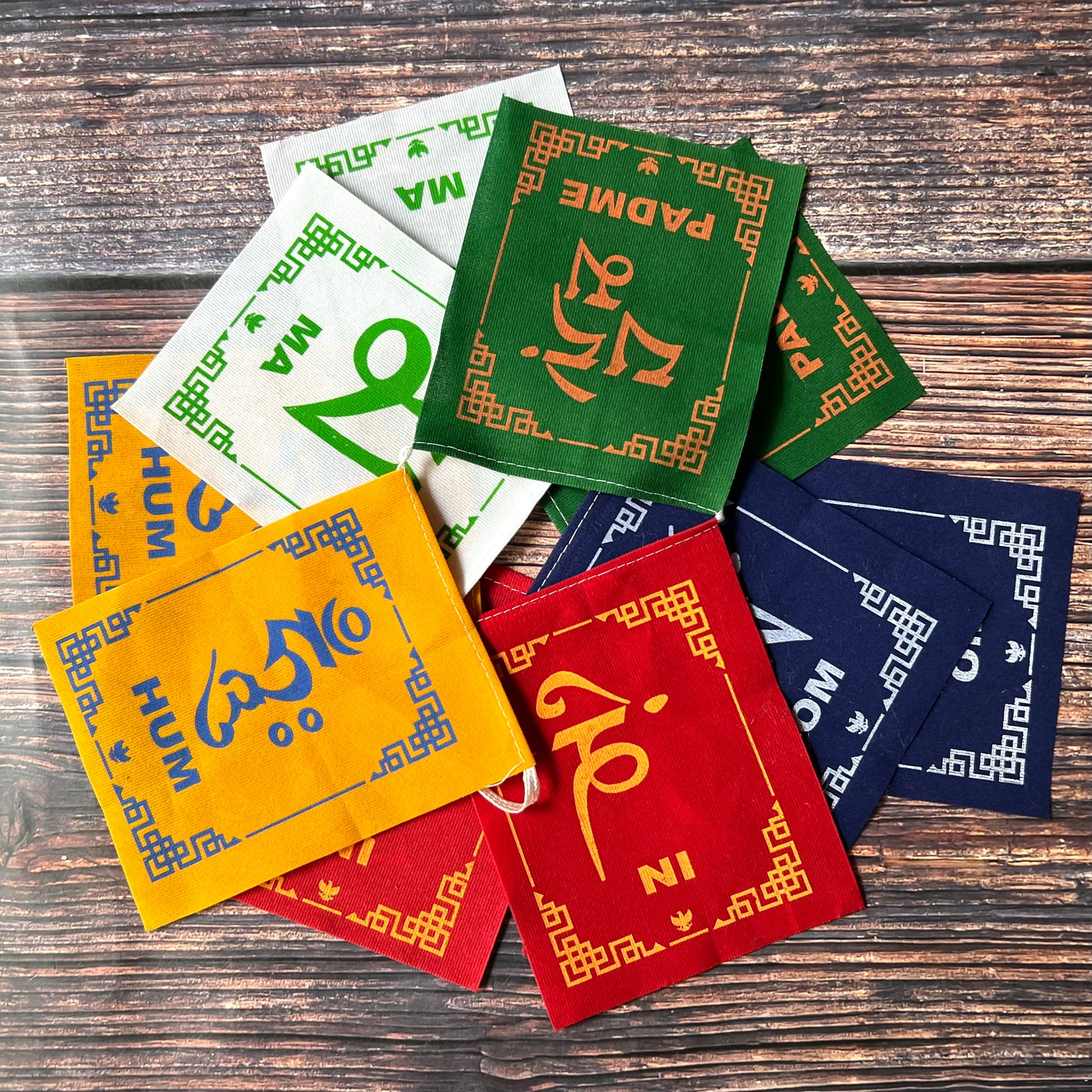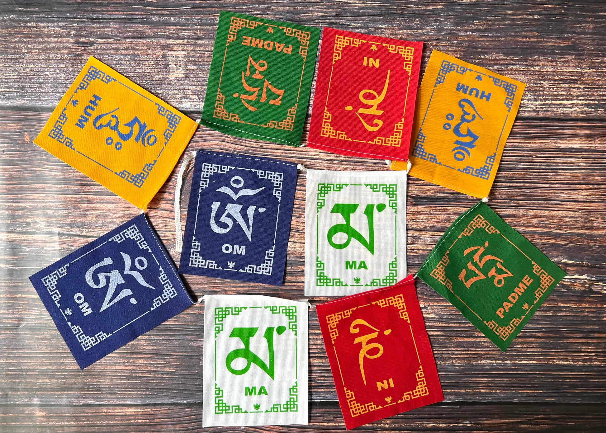Die einzelnen (9x12 cm großen) Fähnchen sind mit Mantra bedruckt.