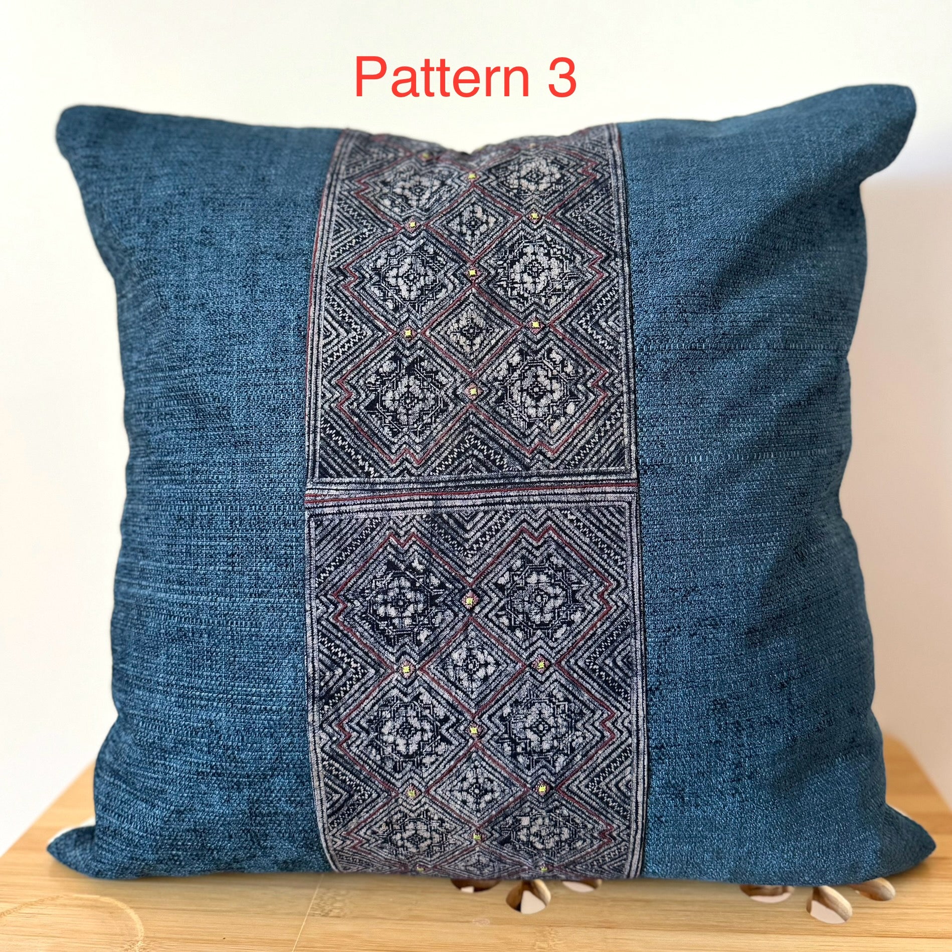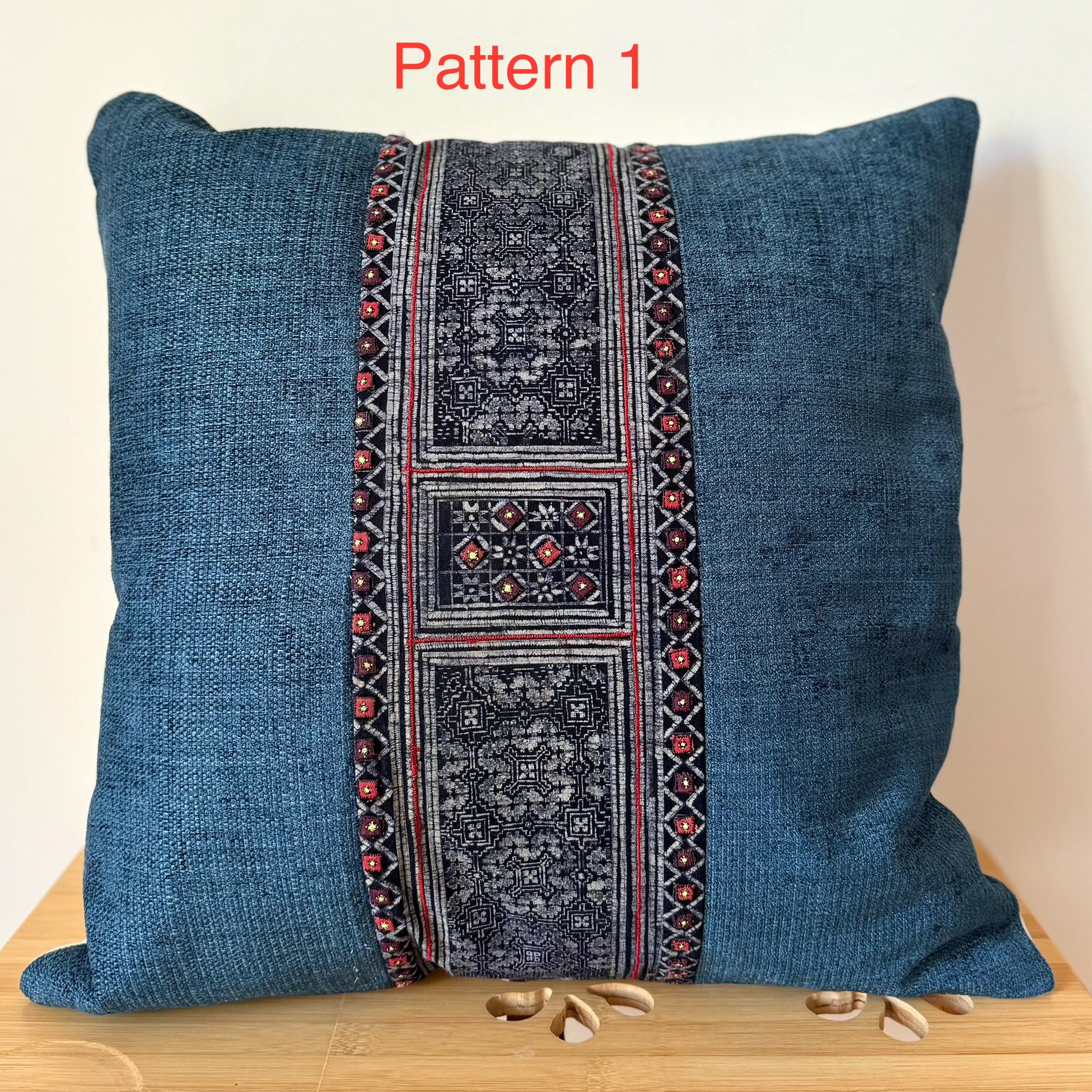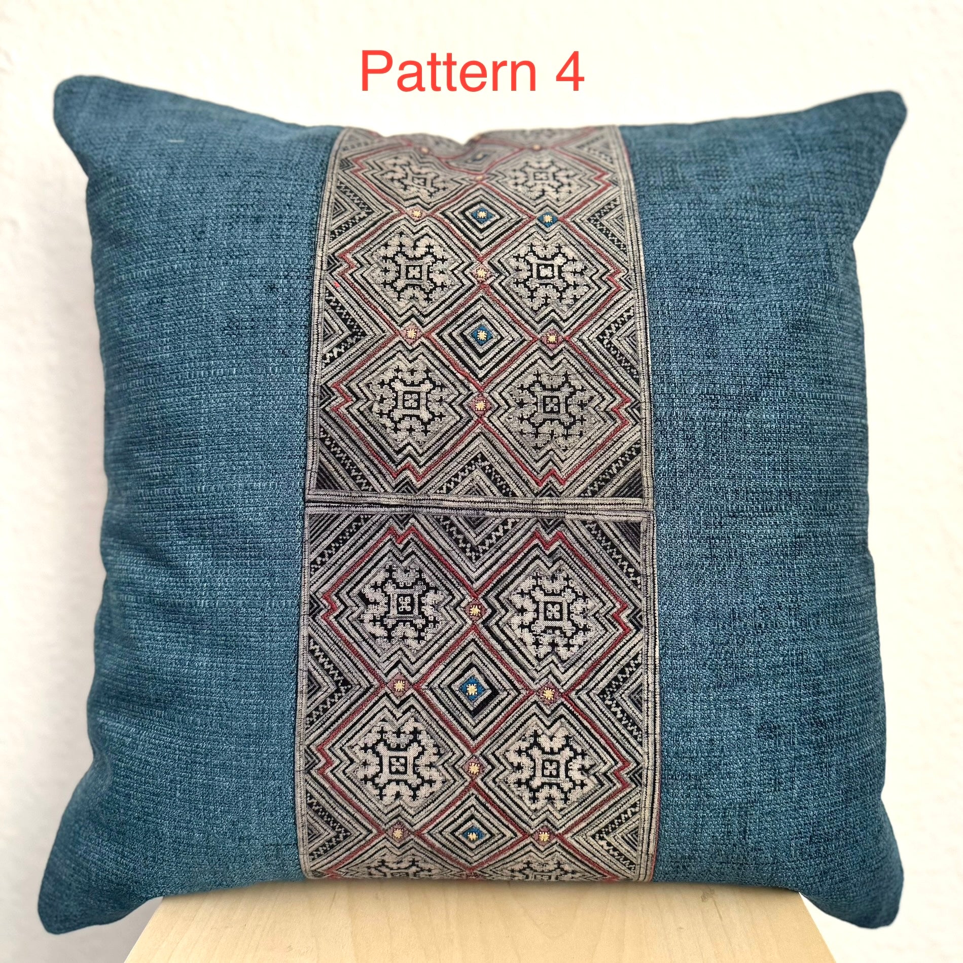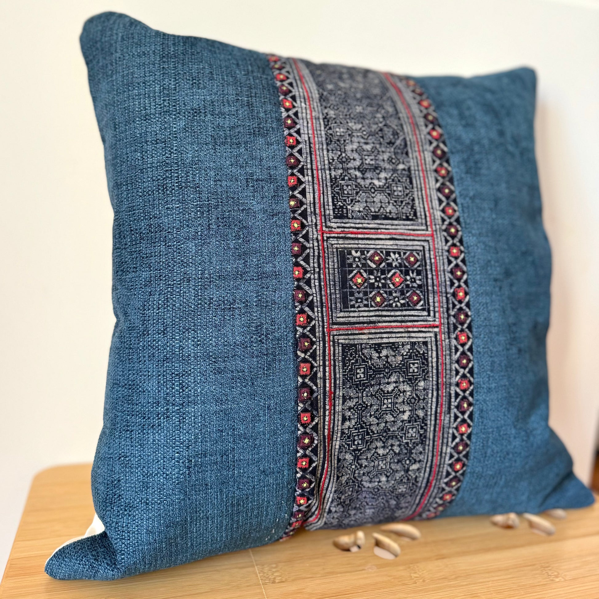 Der Einsatz auf der Vorderseite der Kissen ist aus einem einzigartigen Stück eines vintage H’mong Kleidungsstücks, Baby-Tragetücher, Jacken. Die Muster selbst sind handgemacht mit Batik und einer Indigo-Farbe aus einer lokalen Pflanze. Näherei und Stickerei sind ebenfalls in liebevoller handarbeit hergestellt.