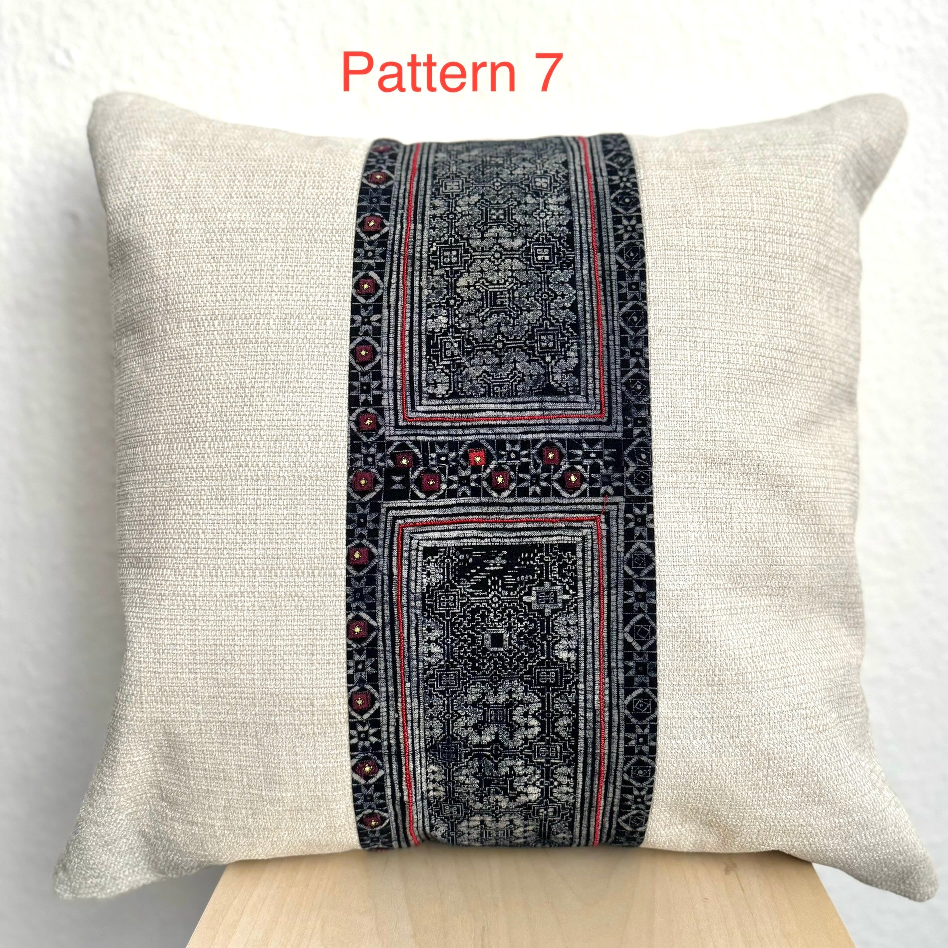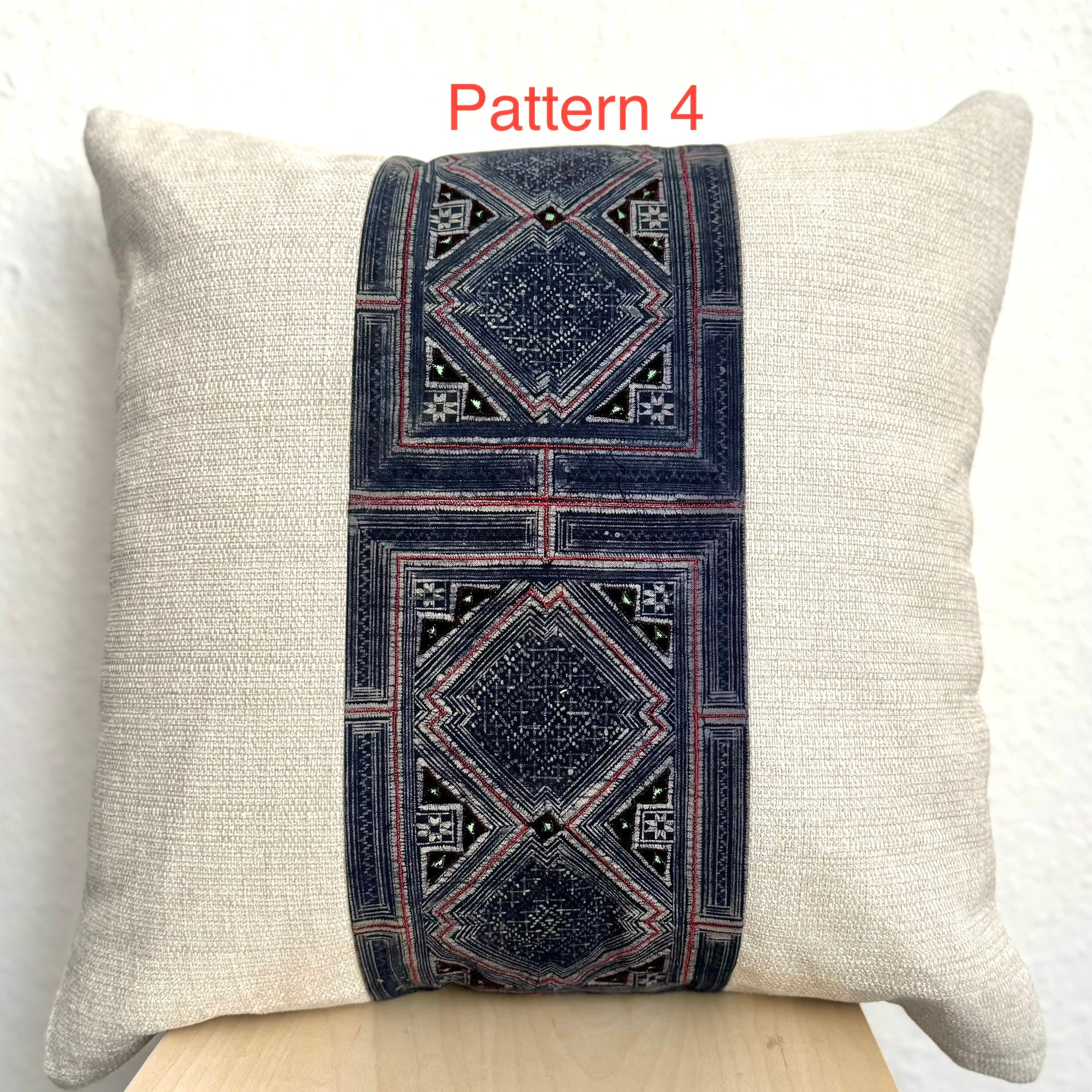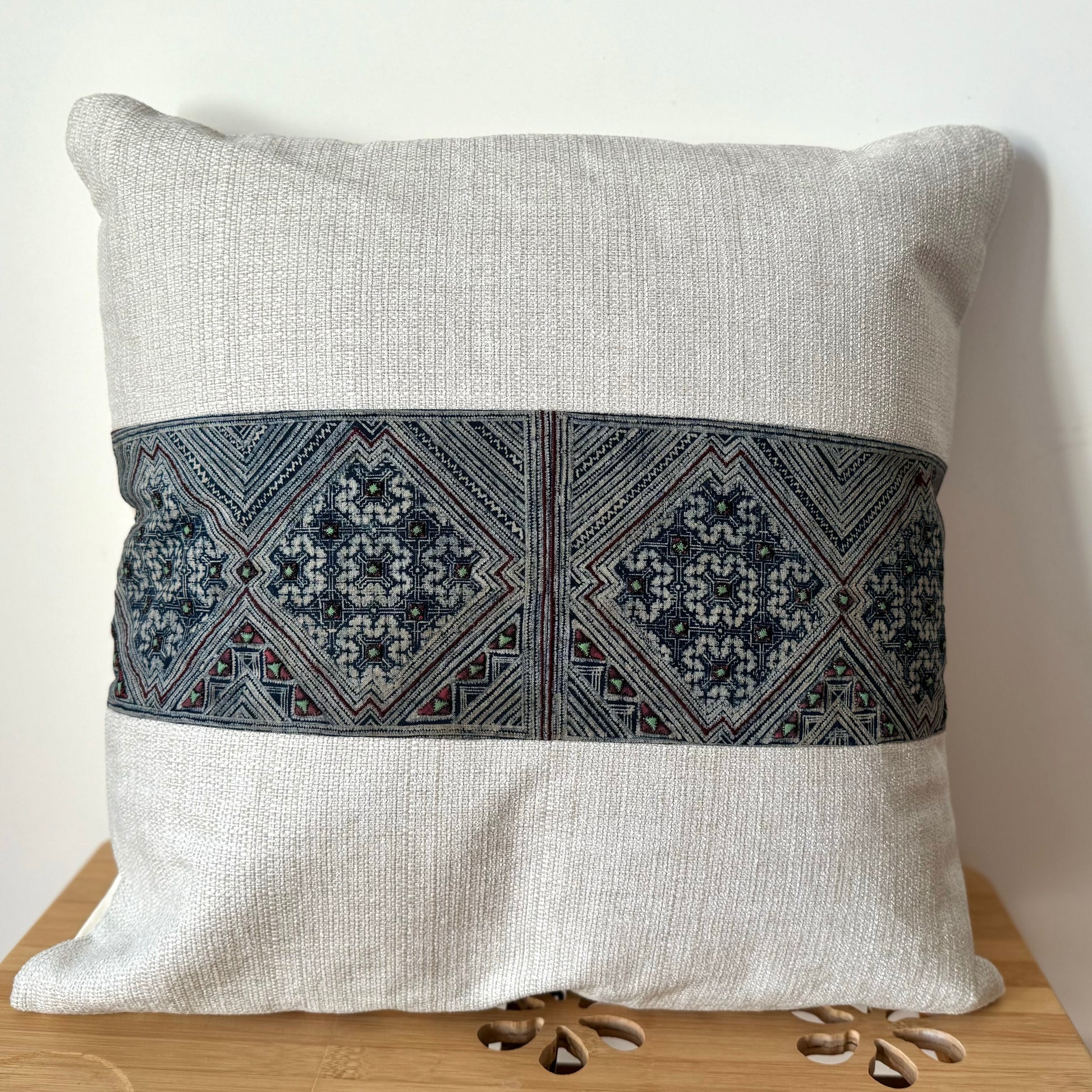 Der Einsatz auf der Vorderseite der Kissen ist aus einem einzigartigen Stück eines vintage H’mong Kleidungsstücks, Baby-Tragetücher, Jacken. Die Muster selbst sind handgemacht mit Batik und einer Indigo-Farbe aus einer lokalen Pflanze. Näherei und Stickerei sind ebenfalls in liebevoller handarbeit hergestellt.