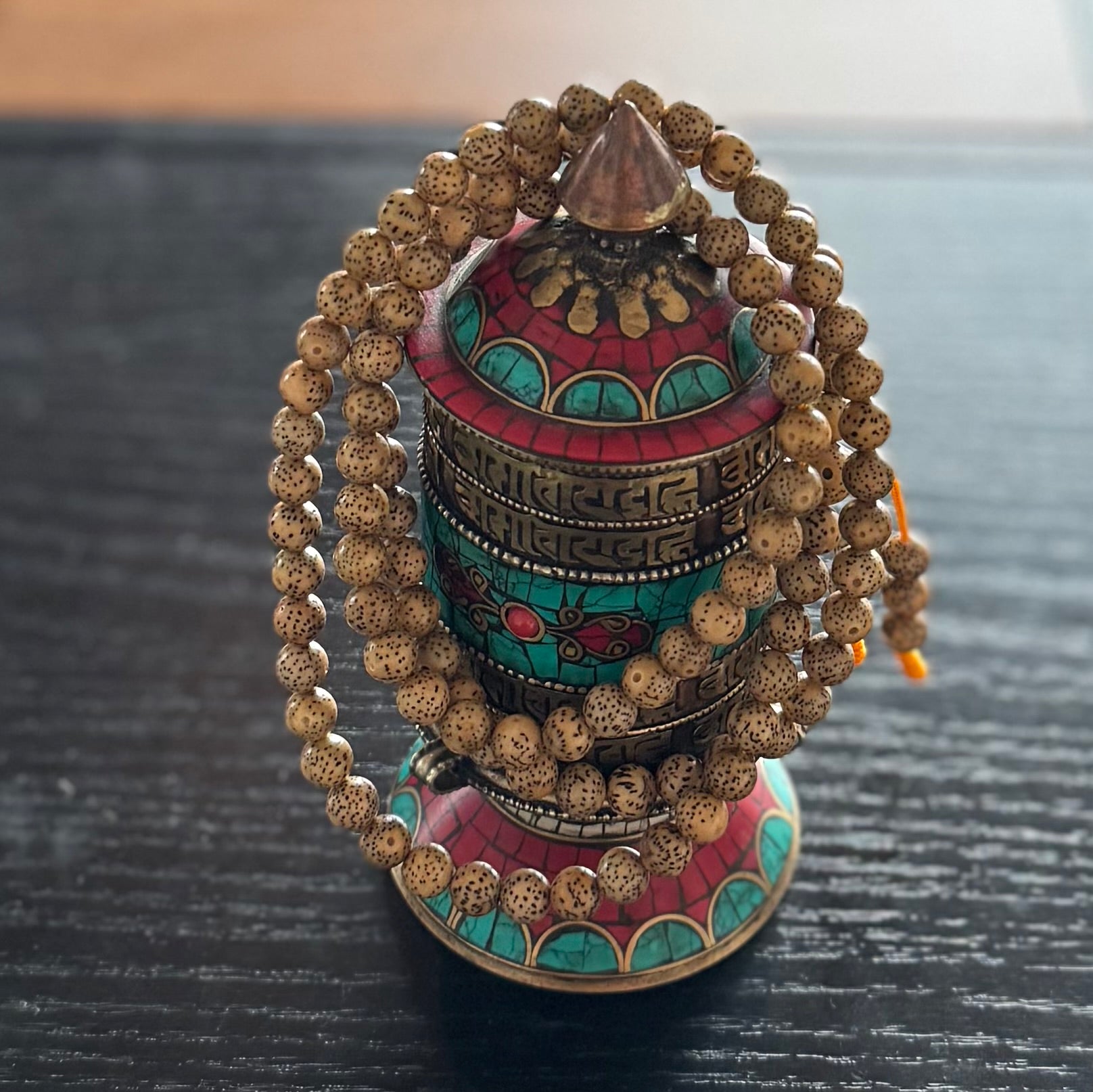 Die 108 (plus Guru-Stein) Perlen sind 7mm im Durchmesser. Der Knoten auf dem Guru-Stein ist nach traditioneller tibetischer Kunsthandwerk-Methode gemacht. Ideal geeignet für alle Meditationsformen.